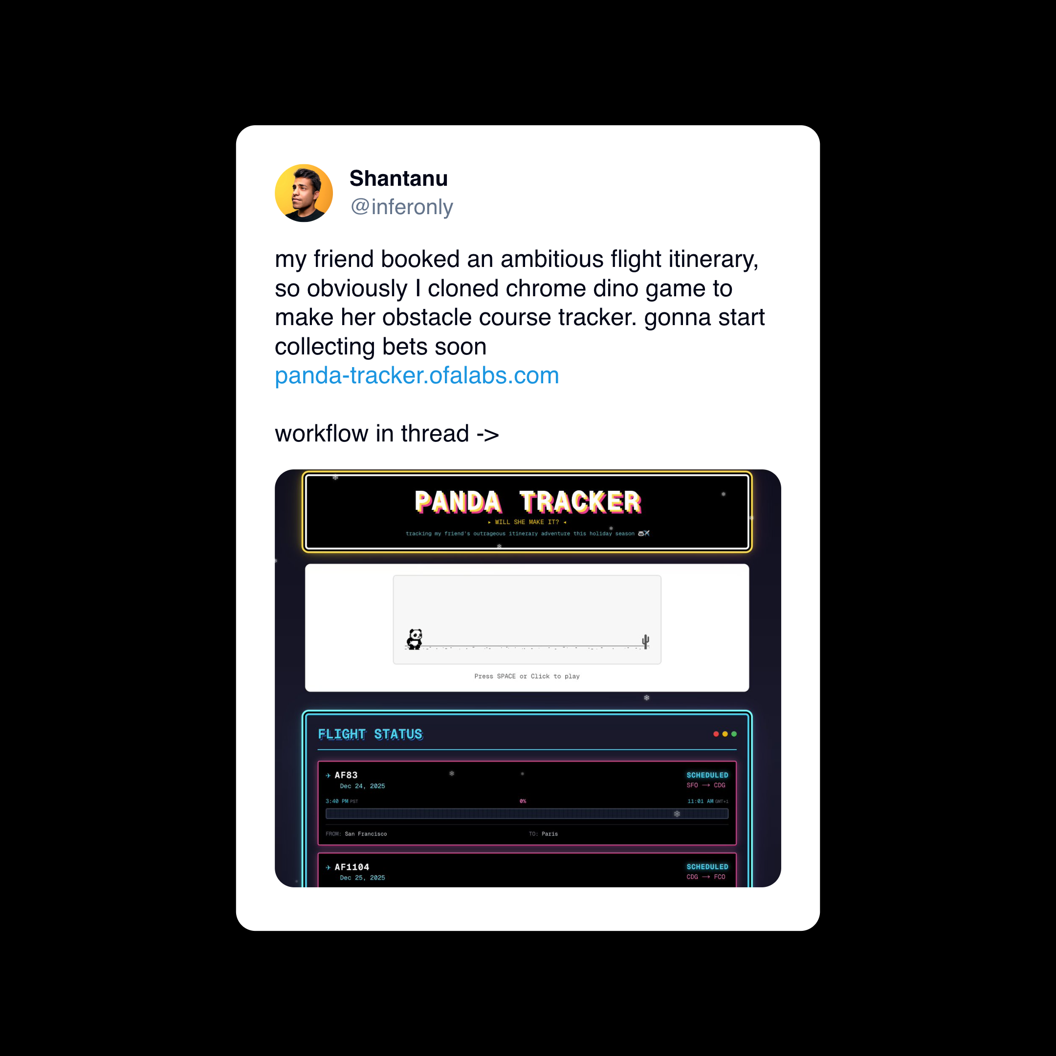 Track a friend’s holiday flights in real-time with a fun twist: a panda-themed Chrome Dino game to kill time while waiting.
